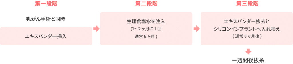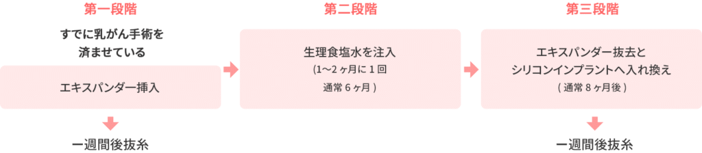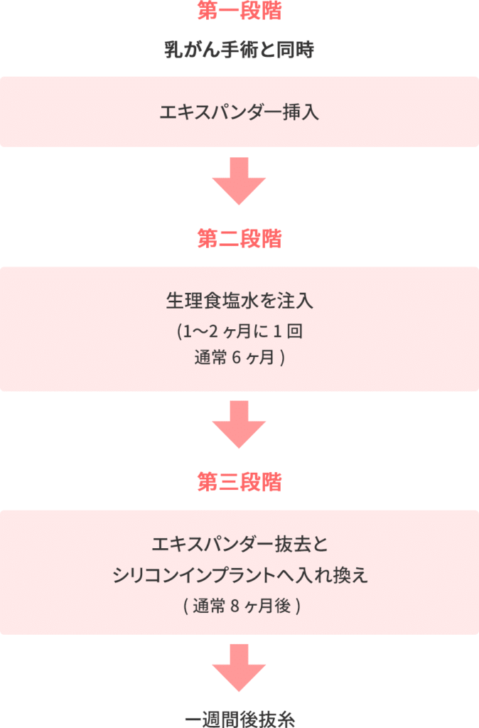乳がん手術と同時にエキスパンダーを留置してから8ヶ月後以降に、反対側より大きくなったらエキスパンダーを抜去し、コヒーシブシリコンインプラントを挿入します。