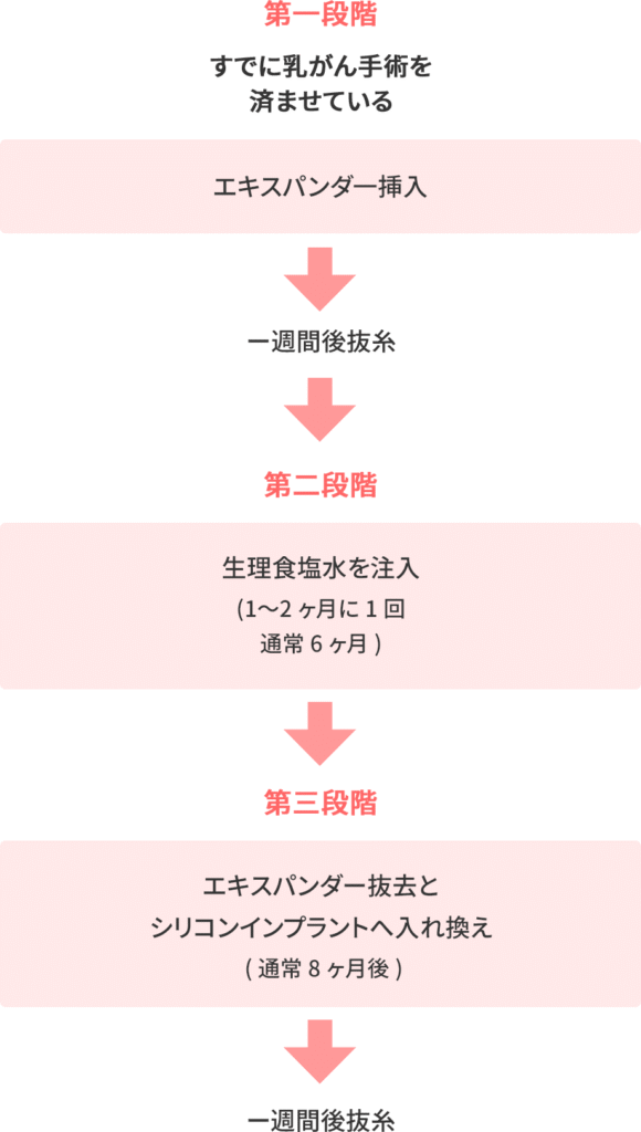 エキスパンダーを挿入して、ある程度、生理食塩水を注入し、ドレーンを入れて縫合するだけですから、このために手術時間が極端に延長したり、入院期間が長引くこともありませんし、他にどこも新しい傷はできていませんから、翌日から歩行も可能です。当然、目が覚めて胸の膨らみがなくなっていることもありません。