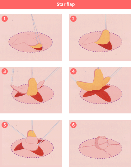 健側に採取するだけの大きさがない場合や、健側をいじりたくない方、両側の再建を行っているケースでは再建された乳房の皮膚を星型に切って組み立てる局所皮弁法(Star flap, Skate flap)が用いられます。