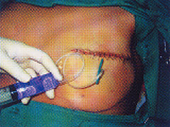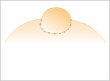 まず、全身麻酔下で乳房切除の傷を切開し、皮膚と筋肉の下にティッシュエキスパンダー(組織拡張器)を挿入します。エキスパンダーは皮膚を伸ばすためのシリコン製の風船で専用の刺入口から生理食塩水を注射し、皮膚を伸展させます。この手術は慣れている医師なら、30分以内で終わります。