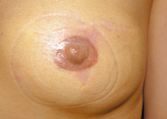 太ももの内側(付け根)の皮膚が体中で一番茶色いので、そこを切って乳輪を再建することができます。取った部分は溶ける糸で縫いますので、抜糸も必要ありません。この方法の場合は、乳頭作成は健側からの移植だけになります。