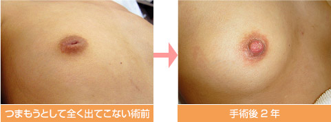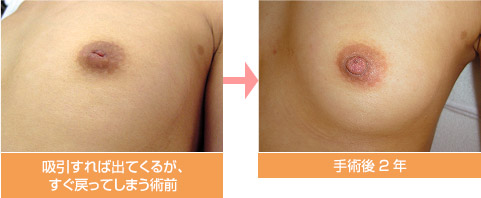 どちらも短時間の手術できれいに直せます。乳管を傷つけず、丁寧に剥がしますので術後の授乳も可能です。合併症は特にありませんが、つまんで出てこない方は約10%の再発率があります。傷もほとんどわかりません。